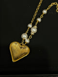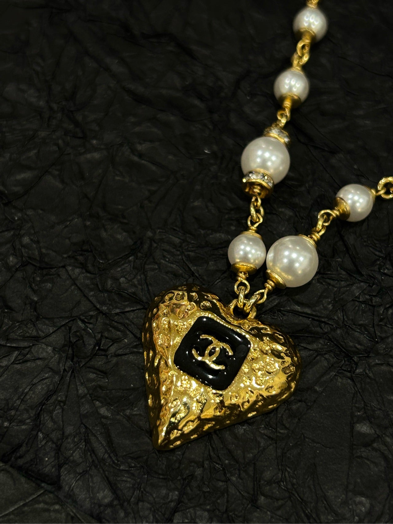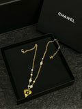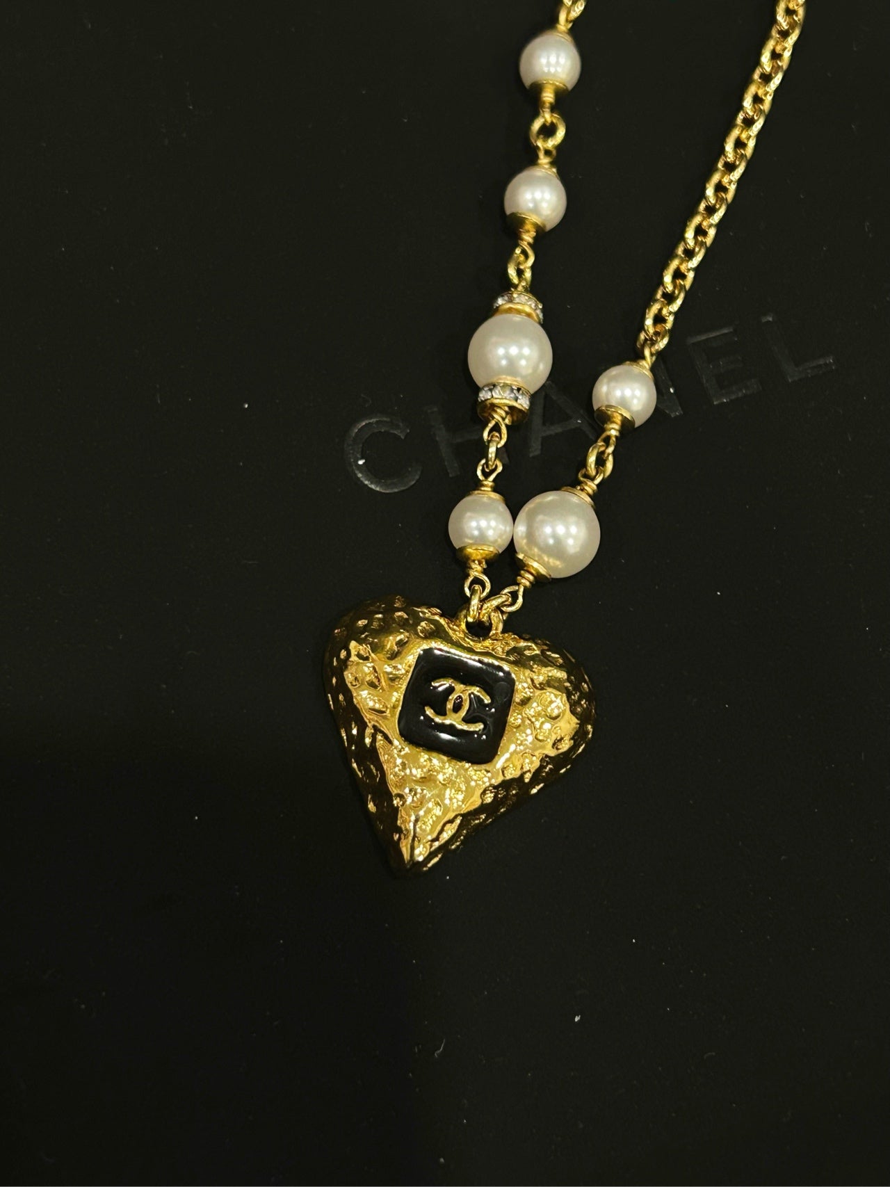 CHANEL 23K Black & Gold Heart Pearl Necklace (With Original Box • 49.5cm Gold-Tone Chain)