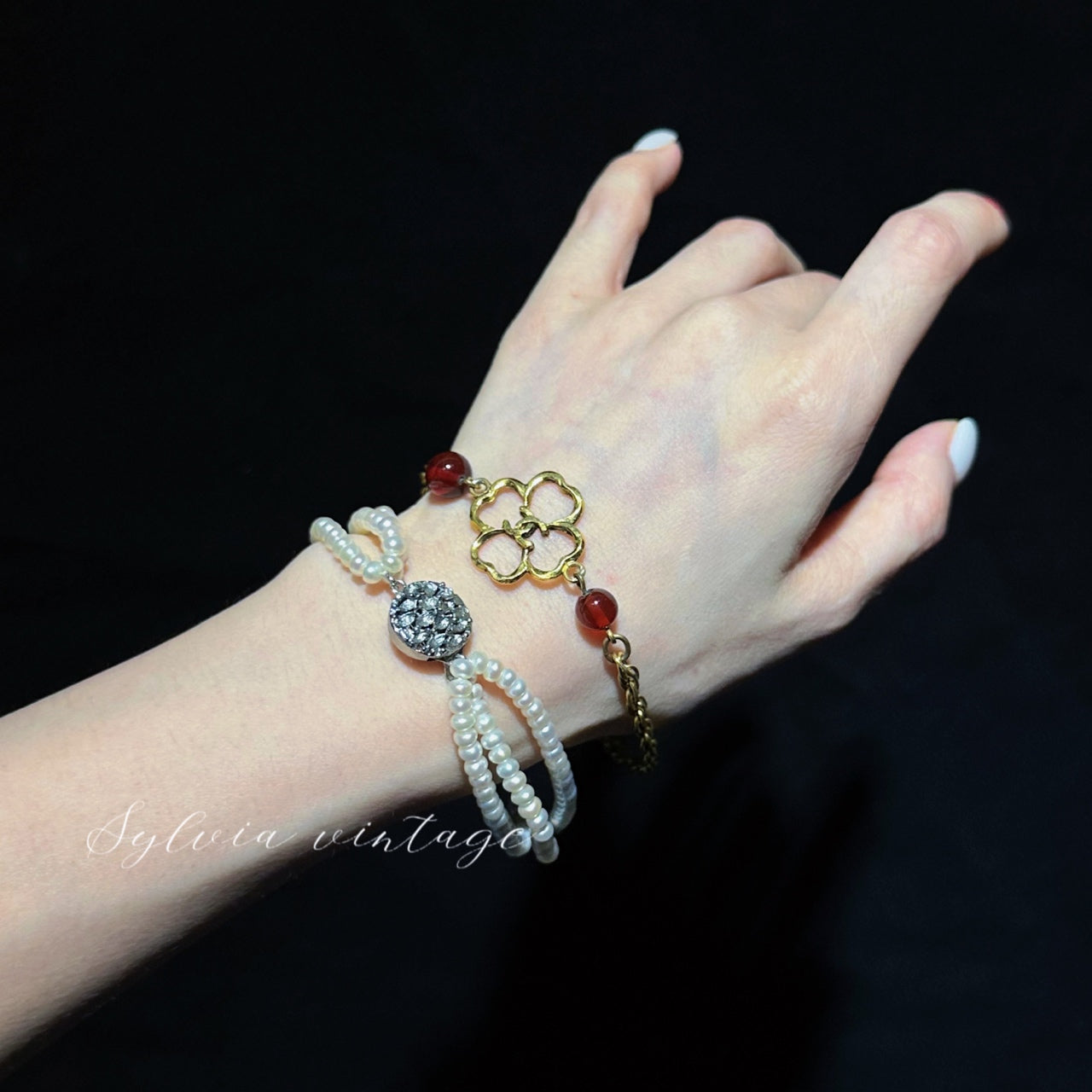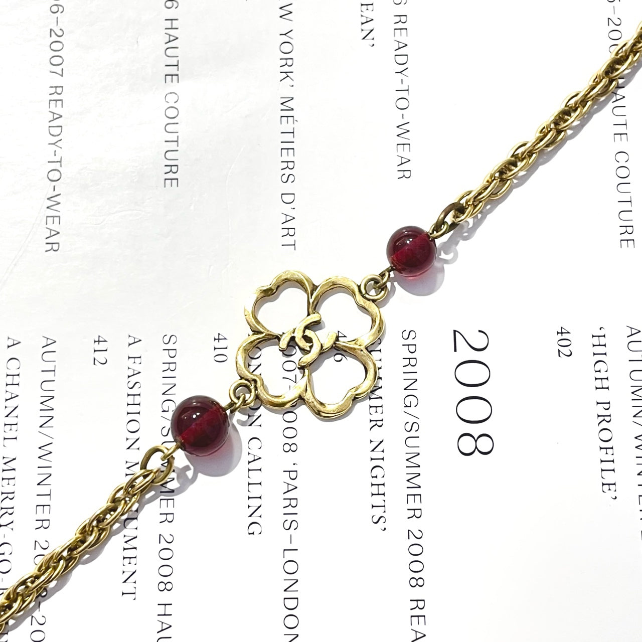 Chanel Vintage 1983 Four-Leaf Clover Bracelet - Distressed Gold & Red Glass Beads - 19.5cm - Grade A - Gold-Plated & Glass